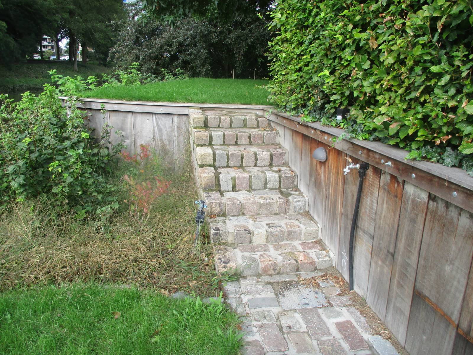 Trappen met zweeds graniet en terrassen met gebakken klinkers.